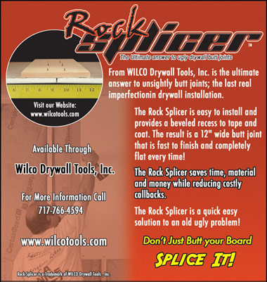 is acceptable in the drywall industry. The RockSplicer is very easy to install. You don’t have to learn any new techniques and the butt joints can be finished the same as factory beveled edges. Finally, drywall butt joints can be finished completely flat and only 12" wide. The RockSplicer saves time, material, and money and reduces costly callbacks. The RockSplicer from Wilco Drywall Tools Inc. has solved the last real problem in drywall installation and finishing, the bulging butt joint.